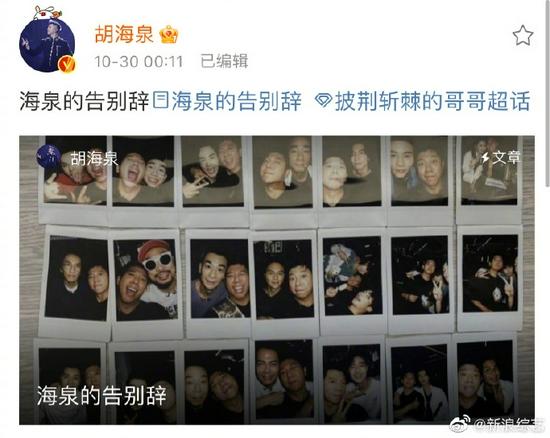 新浪娱乐讯,29日《披荆斩棘的哥哥》总决赛,@胡海泉 卡位18未能加入滚烫唱演家族。随后他微博发长文告别节目,“就算不在一起表演了,也永远是一伙的街道办事hood”。